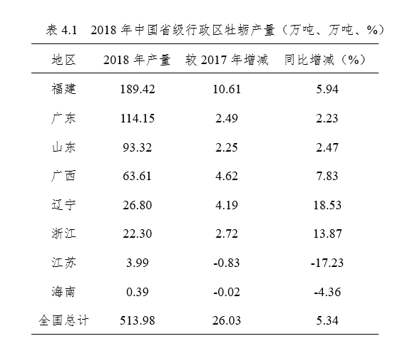 2018年,中国牡蛎总产量达到513.98万吨,同比增加5.34%。福建以189.42万吨的产量位居全国之首,占全国总产量的36.85%,其后依次为广东(114.15万吨)、山东(93.32万吨)和广西(63.61万吨),四地产量均超过了多数年份都位居世界第二的韩国的水平(2017年该国牡蛎产量32.98万吨)。另外,除江苏和海南外,各省级行政区牡蛎产量呈现出普增态势,辽宁、浙江更是分别实现了高达18.53%和13.87%的增长(表4.1)。