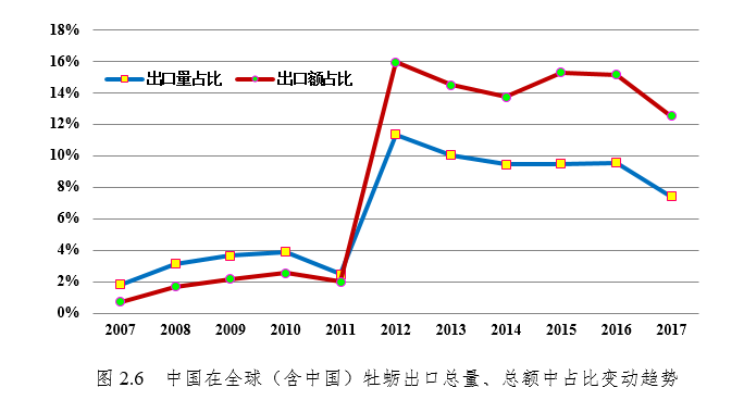2007年,中国在全球牡蛎出口总量、总额中占比分别只有1.82%和0.72,随后递增至2010年的3.90%和2.56%。如同出口量、出口额的变动情形一样,2012年中国在全球牡蛎出口总量、总额中占比也发生了一次大幅跃升,两者分别从2011年的2.47%和1.99%,飙升至11.35%和15.95%这一区间峰值,随后波动下降到2017年的7.41%和12.52%(图2.6)。