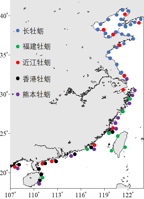 牡蛎,俗称海蛎子、蚝(蠔)、生蚝、蚵仔等,是一种广布性双壳贝类,目前已发现有100多种,世界沿海各国几乎都有生产,产量高居贝类之首。中国拥有丰富的牡蛎资源和利用这一资源的悠久历史。南方沿海一些地区的先民们早在汉朝时就掌握了插竹养蚝技术,至今已有2000余年的历史。新中国成立特别是改革开放政策实施以来,中国牡蛎产量不断增长,进入21世纪后更是呈现出快速大幅提升的态势,2017年占到了全球的83.29%,2018年再创新高,达到513.98万吨(附件1)。中国沿海地区分布着种类多样的牡蛎种群。其中,商业化利用程度最高的是长牡蛎(Crassostrea gigas gigas)、福建牡蛎(C. gigas angulata)和香港牡蛎(C. hongkongensis),而近江牡蛎(C. ariakensis)和熊本牡蛎(C. sikmea)也有一定的养殖规模。图1显示了5种牡蛎在中国沿海的分布情况。