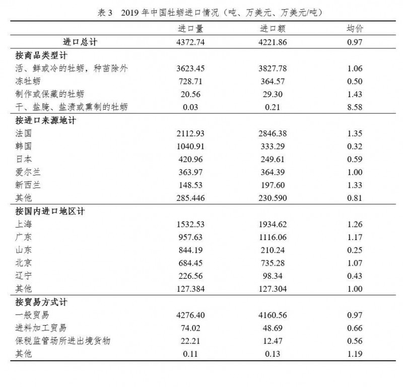 中国海关数据显示,2019年中国牡蛎进口量、进口额和进口均价依次为4372.74吨、4221.86万美元和0.97万美元/吨,同比分别提高6.26%、4.77%和下降1.41%。其中,“活、鲜或冷的牡蛎,种苗除外”是最主要的商品类型,进口量、进口额分别占当年进口总量和总额的82.86%和90.67%,其后依次为“冻牡蛎”、“制作或保藏的牡蛎”和“干、盐腌、盐渍或熏制的牡蛎”。法国、韩国、日本、爱尔兰和新西兰为中国进口牡蛎的前五大来源地,最主要的贸易方式是“一般贸易”(表3)。
