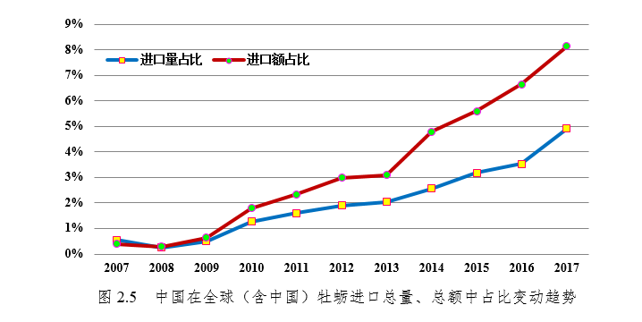 2007年,中国在全球牡蛎进口总量中占比只有0.55%,2008年进一步下降到0.30%,2009年虽然反弹至0.64%,但也几近可忽略不计。这一情形在2010年发生了显著的变化,当年中国占比大幅提高到1.79%,随后除2013年(3.10%)较上年(2.99%)微升外,其他数年呈飙升状态,直至2017年达到8.15%这一迄今为止的历史最高水平(图2.5)。