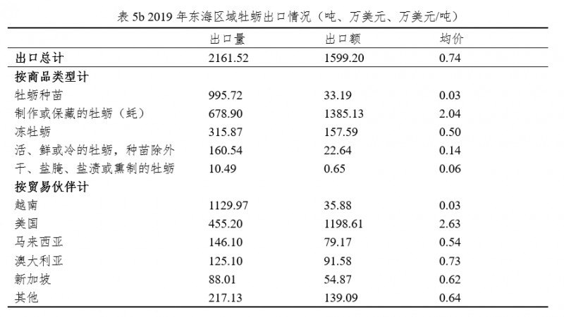 分产品类型看,除牡蛎种苗外,东海区出口的四种产品类型均价都高于黄渤海区的对应产品。东海区的牡蛎种苗全部经由福建出口至越南,其他海区则无种苗出口记录。