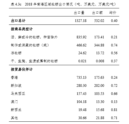 不同于其他两大海区,南海区主要向港澳地区出口牡蛎的活、鲜或冷藏品,以及向东南亚地区出口牡蛎的制作和保藏品,2018年的出口量、出口额分别为1327.18吨和532.02万美元,均价0.40万美元/吨,三项均远低于其他两大海区。