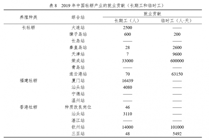 据国家贝类产业技术体系不完全统计,表8列出了2019年中国牡蛎养殖产业直接雇佣的长期工和临时工情况。另外,据估计牡蛎加工业提供的直接就业岗位超过了1.2万人,与牡蛎加工有关的物流、包装、销售等活动所创造的间接就业岗位也在1万人以上。