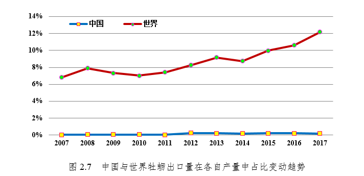 图2.7显示,2007年以来,世界牡蛎出口量在其总产量中占比始终远高于中国的水平,且两者之间的差距随时间推移呈扩大趋势,2017年达到12.19%这一峰值水平。即使如此,这一占比也远低于其他双壳贝类的水平。