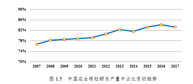 图1.5显示,中国在全球牡蛎总产量中占比从2007年的76.72%,增加到2017年的83.29%。除2014年外,呈逐年增长的态势。其中,占比最小的年份是2007年,2016年达到这一时期的最高水平(84.11%)。