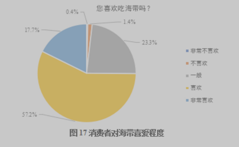由图中数据可知,有57.2%的消费者喜欢吃海带,而且更是有17.7%的消费者非常喜欢吃海带,仅有1.8%的消费者不喜欢或非常不喜欢吃海带,另外还有23.3%的消费者认为一般。经计算消费者对海带的喜好程度(M=3.90,SD=0.702)较高,因此企业应该对海带消费市场有充足信心,消费者对海带产品是有一定偏好的(图17)。