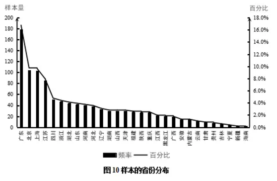 藻类产业体系产业经济研究室于2019年11月-12月开展了主题为“消费者关于海带产品的价值需求、属性偏好及需求结构”的、较大规模的社会问卷调查。此次调查在被社会科学研究者广泛使用的网络问卷调查平台——问卷星上-展开。本次调查共收集问卷1085份,其中有18个被调查者明显异常,被剔除样本,最终的有效样本为1067份,有效样本回收率为98.3%。本调查样本主要覆盖到全国29个省、自治区、直辖市,样本的省份分布如图10所示。
