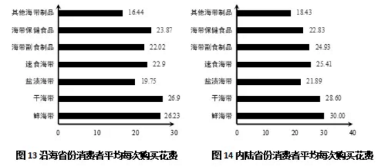 从总体上来看,不管是沿海省份的消费者还是内陆省份的消费者,平均每次购买花费最多的海带品类都是鲜海带和干海带。独立样本t检验的结果表明,沿海省份消费者平均每次购买干海带要花费26.9元,内陆省份消费者平均每次购买干海带要花费28.60元,在平均每次购买花费上没有显著差异(p>0.05);但是内陆省份消费者平均每次购买鲜海带要花费30.00元,沿海省份消费者平均每次购买鲜海带要花费26.23元,内陆省份消费者的花费要显著更多(p<0.05)。以上结果表明,总体上内陆省份消费者的海带食用成本要略微高于沿海省份消费者(图13-14)。