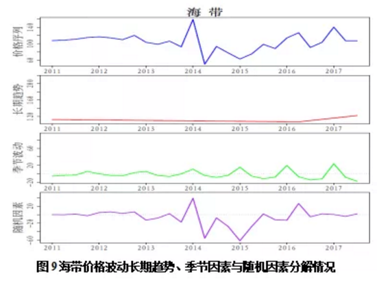 基于STL模型的海带历史价格波动分析结果显示,2011年-2017年期间我国海带价格呈现先小幅回落后波动上涨的趋势,受气候等因素影响2013年前后海带波动剧烈。同时,我国海带价格受长期趋势和随机因素的影响明显,受季节波动影响较小。