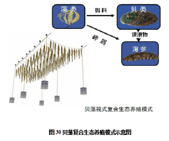 根据海域状况,在不适合投放人工鱼礁的海域,上层进行海带、龙须、裙带等大型藻类筏式养殖,中层吊养鲍、扇贝等海珍品贝类,形成了“藻-扇贝”或“藻-鲍”复合的筏式2层生态养殖模式。
