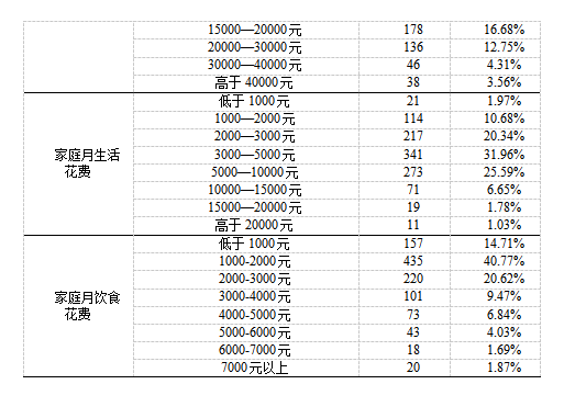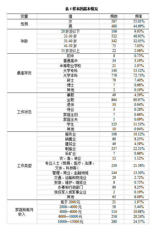 本次调查的受访者中有587名女性(55.01%),年龄分布在16-74岁之间,平均年龄为29.98岁(SD=8.102),样本的年龄覆盖范围较广。样本的家庭人口数分布在1-9之间,平均家庭人口数为3.64(SD=1.130),样本的家庭规模覆盖较广。在受教育水平上,有80%以上的受访者的学历在大学本科及以上,这表明受访者的学历偏高。在工作状态方面,有80.97%的受访者为全职,有11.53%的受访者为学生。在工作类型上,本次调查的受访者的工作主要分布在制造业(22.21%)、专业人士(教育、医疗、法律、文体、科技等)(21.56%)、管理、商业、金融领域(13.50%)和服务业(10.12%)。在家庭月收入方面,本次调查的受访者的家庭税前月收入分布在6000-20000元(61.29%)之间,属于中低收入水平。在家庭月生活花费方面,本次调查的受访者的家庭月生活花费分布在2000-5000元之间(52.3%)。在家庭月饮食花费方面,本次调查有一半以上的(55.48%)受访者的家庭月饮食花费在2000元以下,在饮食方面的投入较少。具体情况见表4: