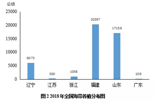 其次,从海带养殖面积分布角度看,目前我国海带养殖主要分布在东南沿海地区和渤海湾地区(图2)。2018年全国养殖海带共计45100公顷,其中福建养殖面积达20397公顷,占比45.23%,是我国海带养殖面积最大的省份;山东养殖面积共计17156公顷,占比38.04%,是我国第二大海带养殖大省;排名第三的是辽宁省,共计6073公顷的养殖面积,占比13.47%;浙江、江苏和广东也养殖海带,但养殖面积较少,三省的总产量占全国总产量较少。