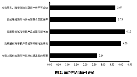 结合上图数据以及计算结果可知,对于“市场上现有的海带种类难以满足我的需要”这一项,均值2.64,标准差0.979。这表明受访者较为认同市场上现有的海带种类是基本可以满足需要的。对于“我希望有海带新产品或海带新吃法推出”这一项,均值4.00,标准差0.778。这表明受访者普遍希望市场上有海带新产品或海带新吃法推出。对于“我愿意尝试海带新产品或海带新吃法”这一项,均值4.19,标准差0.756。这表明受访者普遍愿意尝试海带新产品或海带新吃法。对于“我能够把海带与其他海藻食品区分开”这一项,均值3.73,标准差0.960。这表明受访者基本能够把海带与其他海藻食品区分开。对于“对我而言,海带像陆生蔬菜一样不可或缺”这一项,均值3.67,标准差1.032,这表明受访者基本认同海带像陆生蔬菜一样不可或缺。