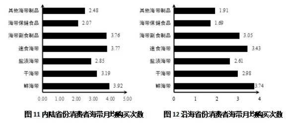 从总体上来看,不管是沿海省份的消费者还是内陆省份的消费者,月平均购买3次以上的海带品类都是鲜海带、速食海带、海带副食制品。独立样本t检验的结果表明,沿海省份消费者月均购买鲜海带3.74次,内陆省份消费者月均购买鲜海带3.92次,二者没有显著差异(p>0.05);沿海省份消费者月均购买速食海带3.43次,内陆省份消费者月均购买速食海带3.77次,二者没有显著差异(p>0.05);但是内陆省份消费者月均购买海带副食制品3.76次,沿海省份消费者月均购买海带副食制品3.05次,内陆省份消费者的月均购买海带副食制品的次数要显著高于沿海省份消费者(p<0.001)。尽管内陆省份消费者和沿海省份消费者在海带保健制品的月均购买次数上都很少,但是相较于沿海省份消费者的月均购买1.69次,内陆省份消费者的月均购买2.07次,要显著更多(p<0.05)。以上结果表明,对于最受消费者青睐的鲜海带和速食海带,沿海省份消费者和内陆省份消费者的消费频率上是一样(图11-12)。
