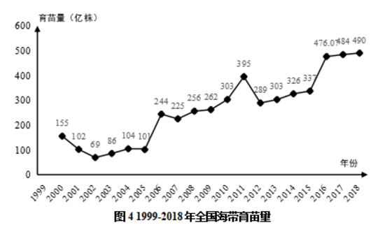 此外,图4表明全国海带育苗量从1999年~2018年总体处于稳步上升的态势。虽然1999年到2002年国内海带育苗总量在下滑,2011年有急剧的下降外,总体育苗量在增加。对比海带年总产量和年育苗量可以发现,海带产量从2014年开始有大幅度增加,相比于2013年约增加了33.3%。虽然从2014年开始,海带总产量逐渐增加,但是对比总产量和育苗量的产出和投入可以看出近年来海带的边际产量是逐渐下降的。可能是近年来全球气温变化以及水体污染等原因对海带生产带来负面的影响,导致海带育苗量的大量投入并不能带来产量的高增长。