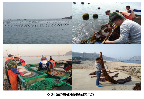 经济效益:多营养层次生态养殖模式将藻类、贝类、海参和鱼类严格按照一定比例搭配,实现了“减量增收”;海带、龙须菜等藻类亩产由2.08吨提高到2.63吨,增产26.5%;扇贝亩产量由1.56吨提高到2.1吨,增产34.6%;鲍亩产量由2.07吨提高到2.48吨,增产19.8%;综合亩产平均提高26.3%。
