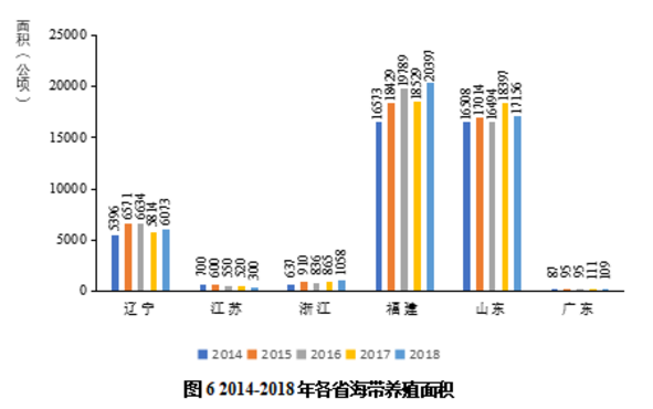图6表明2014年到2018年国内主要海带生产省份的海带养殖面积也有所波动。福建和山东的海带养殖面积波动较大,2014年-2016年,福建的海带养殖面积逐渐增加,2016年,福建海带养殖面积达到19789公顷,但到2017年福建的海带养殖面积下滑近6.4%,但养殖面积的减少没有影响福建的海带产量,总体上福建作为全国海带生产大省,海带养殖面积逐渐增加,海带产量也在增加。山东的海带养殖面积在2014年到2018年间发生比较大的波动,总体养殖面积虽然有所增加,但是海带产量在这5年间处于下滑趋势,平均每年减产近1万吨海带。第三大海带生产省辽宁的海带养殖面积有所波动,但是辽宁的海带产量没有太大波动,处于稳定增长的趋势。江苏省的海带养殖面积逐年减少,随之而来的导致江苏省的海带产量也逐年减少。浙江和广东两省的海带养殖面积逐年增加,但总体上两省的养殖面积较少,仅占全国养殖面积的2.6%。