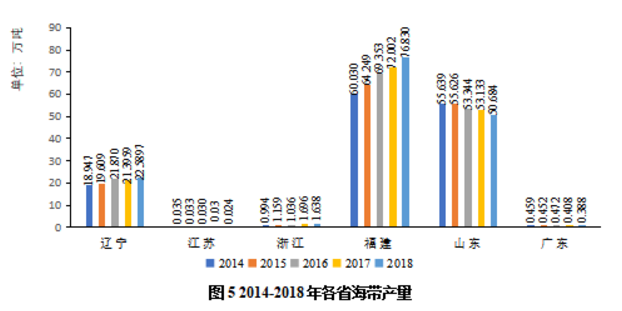 我国海带主产区的三省分别是福建、山东和辽宁(图5),其中福建作为海带养殖最大的省份,近5年的海带产量处于增长趋势,平均每年增长6.40%,是全国海带产量增长速度最快的省份,并且超过全国海带产量增长的平均值。除福建之外,辽宁省近5年的海带产量也处于增长趋势,涨幅略小。而作为海带生产第二大省的山东,近5年的海带产量逐渐下滑,但仍然维持在50万吨以上。对比之下,浙江、广东和江苏三省的海带产量较小,每年海带产量略有波动。