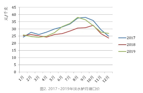 2017年至2019年我国淡水鲈年平均塘口价分别为30.52、27.23和29.49元/kg,全年塘口价变化具有明显的季节性,每年的1-4月份,价格保持相对稳定,5~9月价格逐渐上升至全年最高价,10月后,由于年底收获集中上市,价格开始下跌至年初。2017-2019年我国淡水鲈月塘口价变化情况见图2。