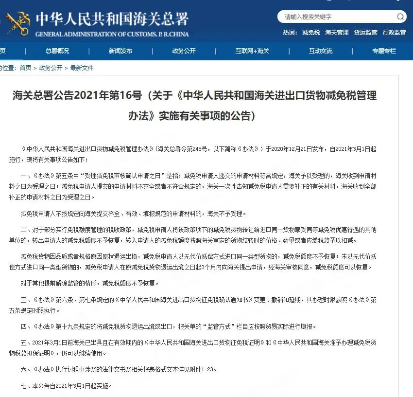 2月25日,海关总署公告2021年第16号(关于《中华人民共和国海关进出口货物减免税管理办法》实施有关事项的公告)。公告对自2021年3月1日起实行的(海关总署令第245号)《中华人民共和国海关进出口货物减免税管理办法》(以下简称《办法》)的有关事项进行了重点说明。
