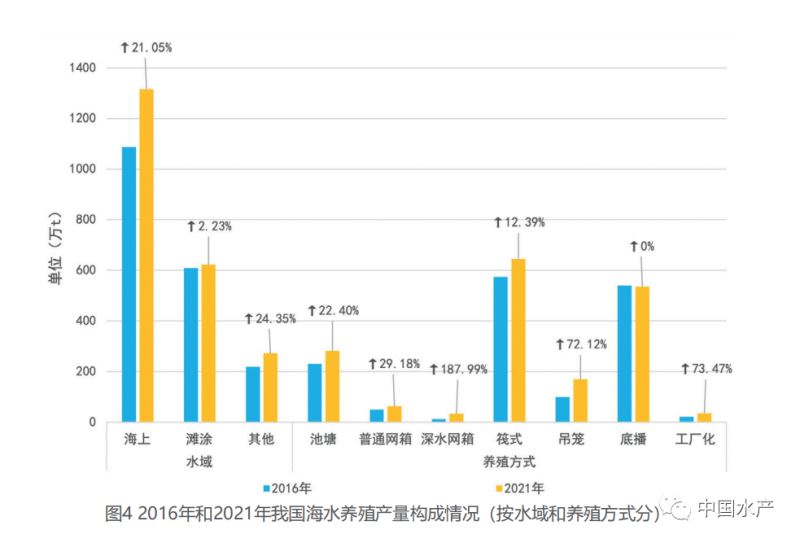 海水养殖产量总体上呈上升趋势。从2016年和2021年我国海水养殖产量构成情况(按水域和养殖方式分,见图4)看,2021年,海水养殖产量比2016年增加259.83万t、增长15.45%。其中:按养殖水域分,海上、滩涂、其他水域分别增长21.05%、2.23%和24.35%;按养殖方式分,尤以深水网箱、工厂化、吊笼发展最快,2021年分别比2016年增长187.99%、73.47%和72.12%,其次是普通网箱、池塘、筏式养殖,分别增长29.18%、22.40%和12.39%,底播增殖保持相对稳定。