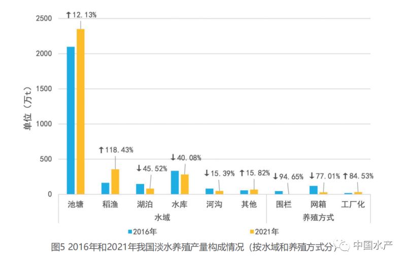 淡水养殖产量总体上也呈上升趋势。从2016年和2021年我国淡水养殖产量构成情况(按水域和养殖方式分,见图5)看,2021年,淡水养殖产量比2016年增加305.38万t、增长10.61%,但增幅低于海水养殖,且受到渔业提质增效、渔民增收现实需要、养殖科学技术进步和水产养殖水域环境治理等多种因素影响,不同养殖水域和养殖方式产量有增有减。其中:按养殖水域分,稻渔综合种养发展最为迅速,产量增加192.85万t,增长118.43%;池塘和其他水域产量略有增加,分别增长12.13%和15.82%;湖泊、水库、河沟产量大幅下降,分别减少45.52%、40.08%和15.39%,共减少150.82万t。按养殖方式分,工厂化养殖发展态势良好,增长84.53%,围栏和网箱养殖下降幅度较大,分别下降94.65%和77.01%。因此,“十三五”以来,我国不同养殖水域和养殖方式的产量变化情况不一。总体上,海淡水池塘养殖产量稳步增长,滩涂、底播增殖保持稳定,稻渔的快速增长有效弥补了湖泊、水库、河沟等养殖产量的下降,以深水网箱、工厂化为代表的设施养殖发展迅速,为我国今后水产养殖业的发展领域及空间拓展指明了方向。