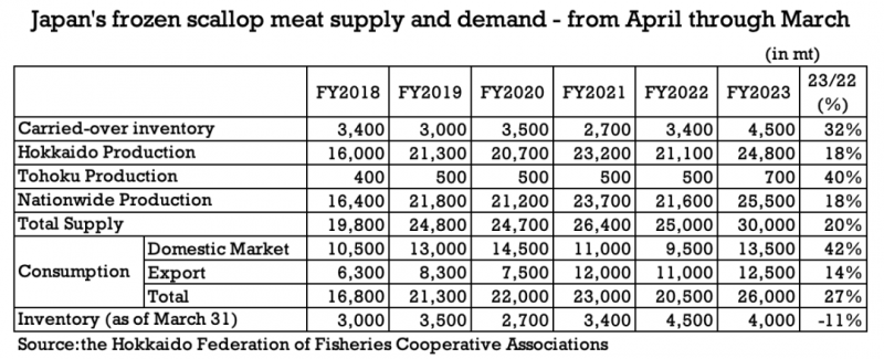 据统计,2023财年(截至2024年3月份)日本国内冷冻扇贝肉消费量同比增长42%,达到1.35万吨,这是近三年来内销量首次超过出口。