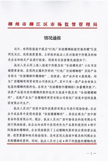 执法人员从网上进入报道中所提及的“孙姐螺的店”小红书店铺搜索查询,发现网友爆料所称的“灯泡厂孙姐螺蛳粉”实际产品名称为“孙姐螺柳州螺蛳粉”。经核查,该产品共有4款规格,均为广西螺蛳哥商贸有限公司委托生产。其中只有一款产品含有独立包装的螺蛳肉配料包,名称为“孙姐螺柳州螺蛳粉(加量螺肉款)”,该款产品袋内放的螺蛳肉配料包即为报道中提及的“孙姐螺螺蛳肉”,该款产品为广西螺蛳哥商贸有限公司委托广西美申园科技集团有限公司生产。