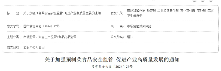 比较新的是2024年3月份,国家市场监督管理总局等六部门联合发布的《关于加强预制菜食品安全监管 促进产业高质量发展的通知》。