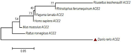 2019-nCoV S蛋白的细胞受体也是ACE2,2019-nCoV对细胞的入侵依赖于细胞受体ACE2[1]。利用MegAlign 软件对来源于人、小鼠、大鼠、蝙蝠、果子狸、斑马鱼的AEC2氨基酸进行遗传距离分析。结果显示,哺乳动物间ACE2氨基酸的相似性,在77.7%~91.3%之间,而斑马鱼与其他哺乳动物的ACE氨基酸的相似性,在74.7%~78%之间(图3)。基于不同动物ACE2氨基酸序列,采用Neighbor-joining 法构建的进化分析结果显示,与哺乳动物相比,斑马鱼被单独为一簇(图4)。上述结果表明,鱼和哺乳动物间有较远的亲缘关系,且鱼与哺乳动物的ACE2氨基酸序列差异较大,推测其蛋白的结构也一定存在较大差异,从而影响2019-nCoV S蛋白与鱼类细胞的结合。因此,鱼类ACE2很难介导2019-nCoV进入鱼体细胞,2019-nCoV不能利用鱼体细胞进行增殖,从而进一步证明了水产动物不能成为2019-nCoV的宿主。