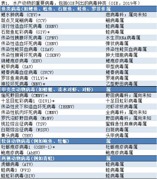 SARS-CoV-2属于冠状病毒科、乙型冠状病毒属(WHO,2020)。冠状病毒科有5个属,都只感染鸟类和哺乳动物(Hemida和Ba Abduallah, 2020),而乙型冠状病毒只感染哺乳动物。感染水产动物的病毒种类繁多,有20多个病毒科,多个属(见表1),但是它们都不属于冠状病毒科。世界动物卫生组织(OIE)已经制定了评估水产动物物种是否是病原体感染易感宿主的标准(OIE,2019a)。