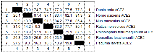 Danio rerio ACE2:斑马鱼ACE2,GenBank登录号NM_001007297.1;Homo sapiens ACE2:人ACE2,GenBank登录号NM_001371415.1;Mus musculus ACE2:小鼠ACE2,GenBank登录号NM_001130513.1;Rattus norvegicus ACE2:大鼠ACE2,GenBank登录号NM_001012006.1;Rhinolophus ferrumequinum ACE2:马铁菊头蝠ACE2,GenBank登录号AB297479.1;Rousettus leschenaultii ACE2:棕果蝠ACE2,GenBank登录号GU253336.1;Paguma larvata ACE2:果子狸ACE2,GenBank登录号AY881174.1