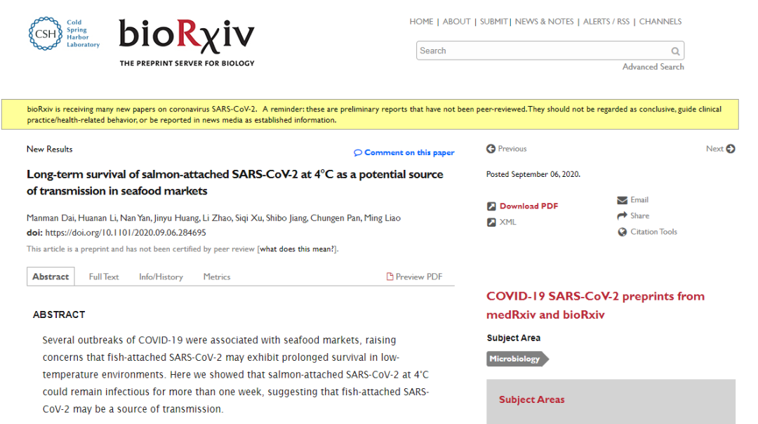 9月6日,华南农业大学廖明教授团队在生物学预印本bioRxiv上发布一篇研究论文,题为“携带病毒的三文鱼是疫情潜在传播源”(Long-term survival of salmon-attached SARS-CoV-2 at 4°C as a potential source of transmission in seafood markets)。
